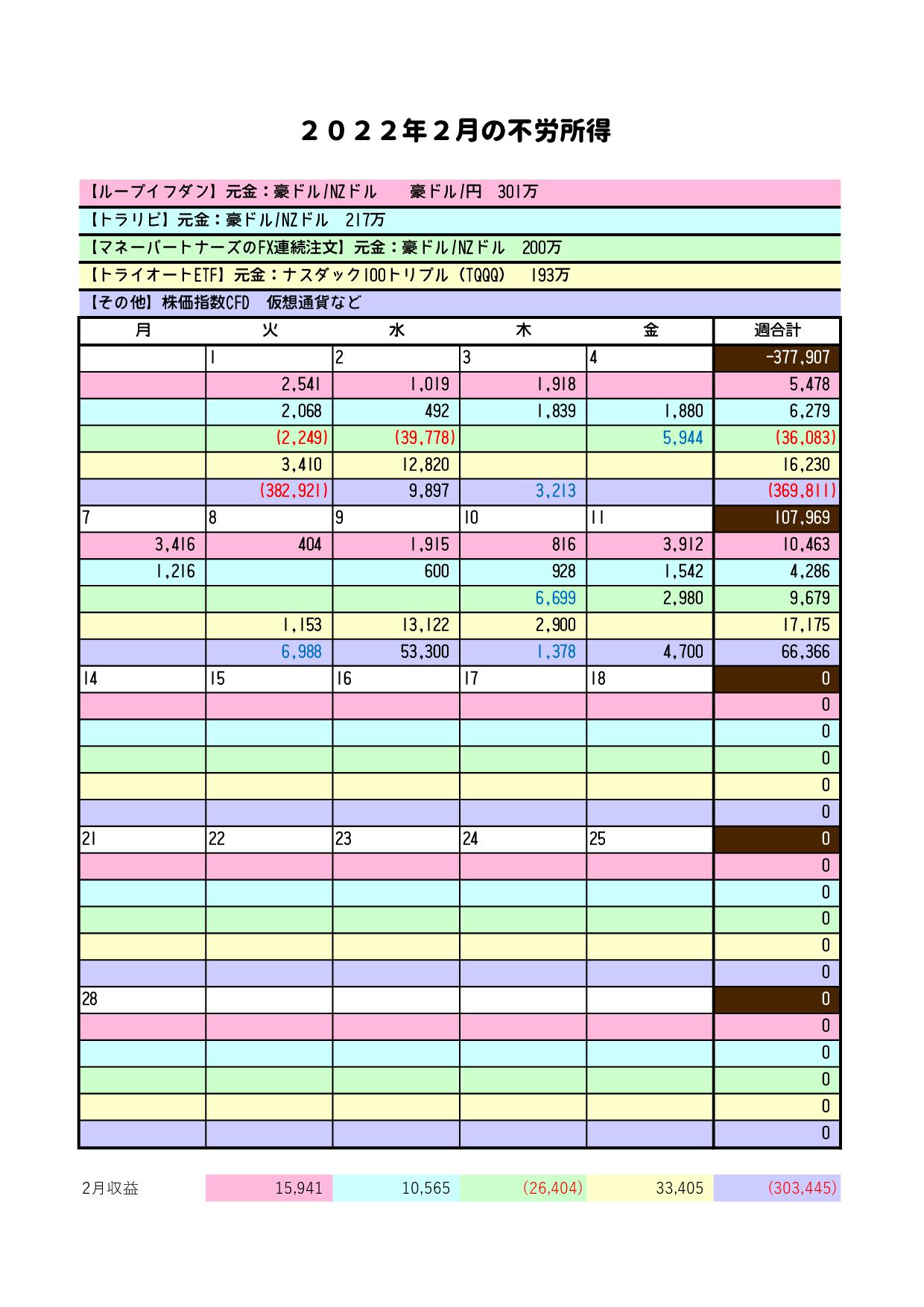 今週で底打ちして底上げ相場だと安心していたら木曜日から2日間で大きく下げてしまいました。株価というよりも10年債の金利上昇が株価を押し下げていることも要因だと思います。金曜日のニューヨーク時間にロシアのウクライナ侵略の定かではない報道で、投げ売りが出てしまいました。為替も株価も大きな下げでした。今年の相場は、例年通りの動きではないので、本当に難しいです。特にトライオートETFのリスクを取りすぎているので、何とか相場から退場しないように資金管理をしっかりします。