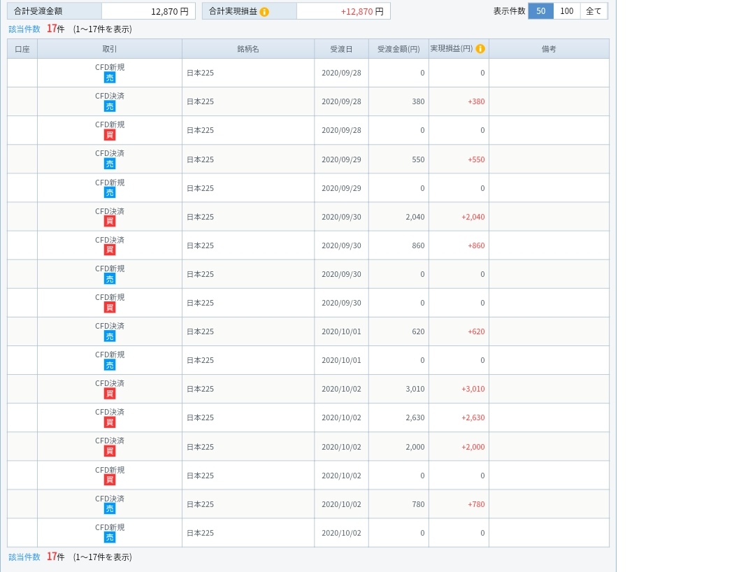 9/28~10/3の成績は、プラス12870円でした。 |